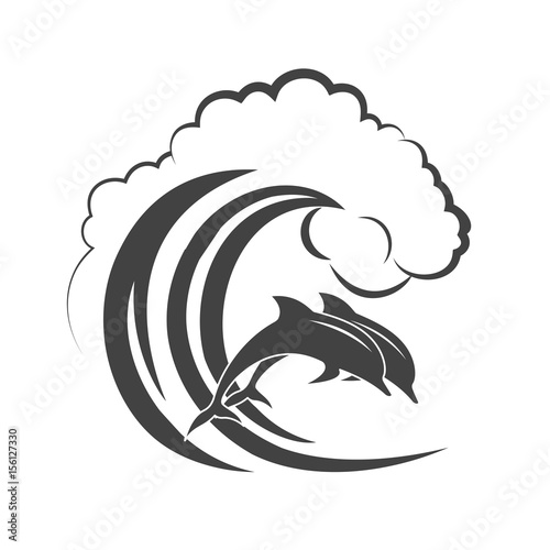 © dervish15, Obraz premium Pack of dolphins springing in waves, a monochrome icon.