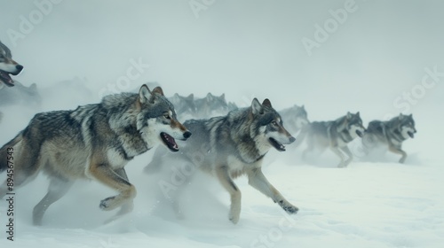 Naklejka premium Pack of Wolves Running Through Snowy Landscape, Winter Wildlife, Nature Scene...