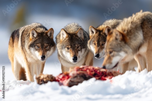 © vectorizer88, Obraz premium Pack of Wolves Surrounding Carcass in Snowy Terrain Under Bright Sunlight