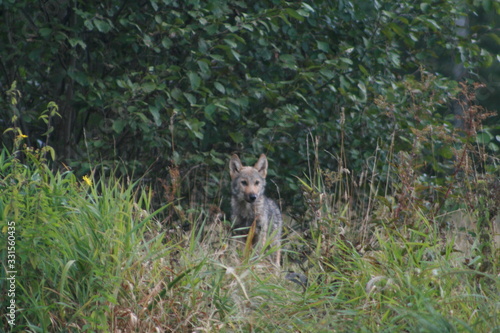 © adventure, Naklejka premium Pack of young wolves cubs near river