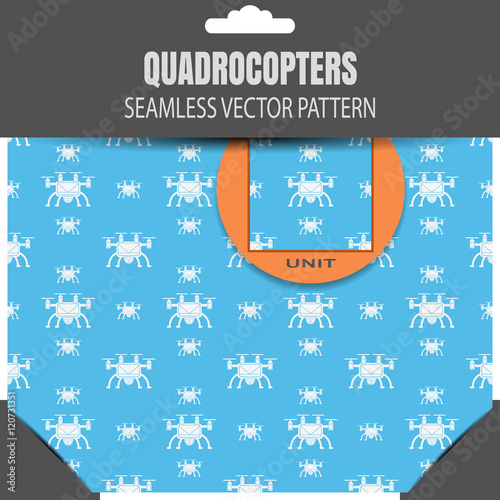 © DreamLine_, Fototapeta premium Package of vector seamless pattern of quadrocopters on the blue background with allocation.
