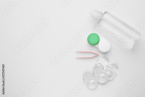 Naklejka premium Packages with contact lenses, case, tweezers and drops on white background, flat lay. Space for text