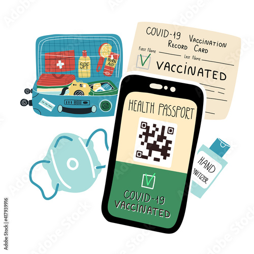 © Art n Peaches, Naklejka premium Packing to travel 2021 set.Clothes, documents, hand sanitizer and medical face mask, Health pass app or Vaccination card
