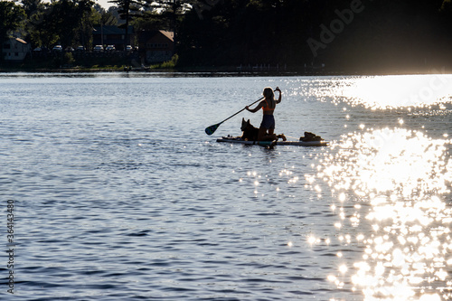 © Bill Keefrey, Naklejka premium paddle boarding on lake with dog