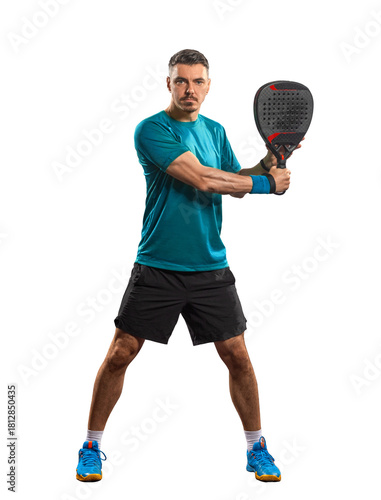 Fototapeta premium Padel player isolated on white background. Full body view. Open social tour...