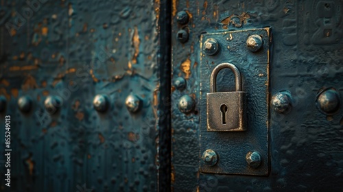 Fototapeta premium Padlock on a metal door with rivets, secure and locked