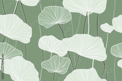 © Odrua Design, Obraz premium Padrão contínuo (seamless pattern) de folhas estilizadas em tons de verde com linhas delicadas em branco, criado com IA generativa.