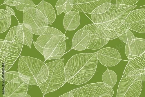 © Odrua Design, Obraz premium Padrão contínuo (seamless pattern) de folhas estilizadas em tons de verde com linhas delicadas em branco, criado com IA generativa.