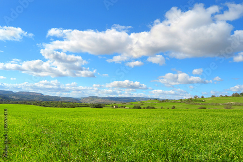 © oraziopuccio, Naklejka premium Paesaggio con una collina verde e delle belle nuvole nel cielo azzurro