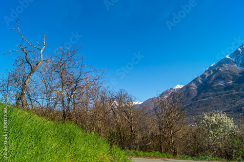Obraz premium Paesaggio montano, panorama di montagna, primavera, cielo blu e prato