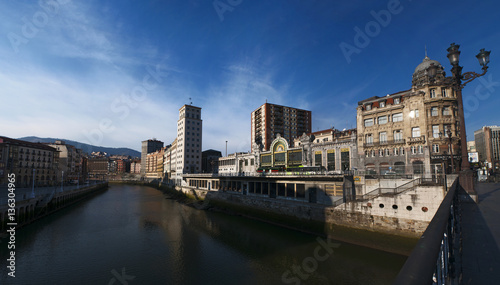 © Naeblys, Obraz premium Paesi Baschi, Spagna, 26/01/2017: il fiume Nervion e lo skyline di Bilbao con la stazione di Bilbao Concordia, nota anche come stazione di Bilbao Santander e costruita in stile modernista liberty