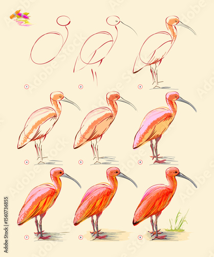 Naklejka premium Page shows how to learn to draw from life sketch of the scarlet ibis. Creation step by step painting with pastel chalks. Educational page for artists. Hand drawn vector illustration.