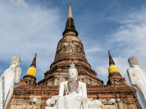 Naklejka premium Pagoda and Buddha statues at Wat Yai Chai Mongkhon temple of archaeological park in Ayutthaya Thailand.