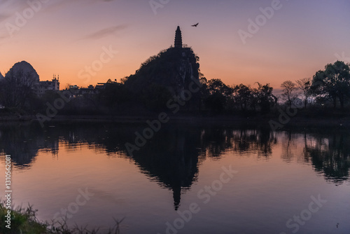 © Tatiana Kashko, Obraz premium Pagoda and the city buildings surrounded by the limestone mountains