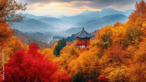 © SepazWorks, Naklejka premium Pagoda Surrounded by Autumn Forest with Distant Mountain