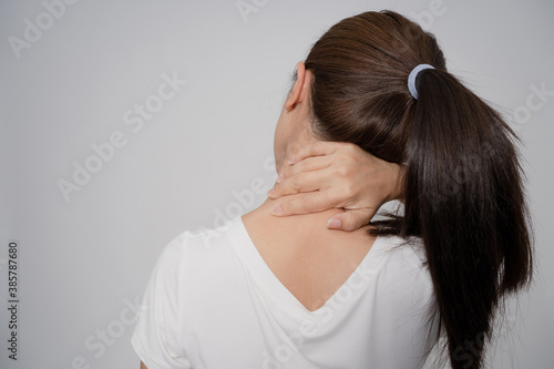 Fototapeta premium Pain in a waman's body, Closeup of young woman have neck and shoulder pain.