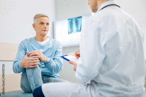 Obraz premium Pain in the knee. Good looking nice aged man holding his knee and looking at his doctor while explaining where he feels pain