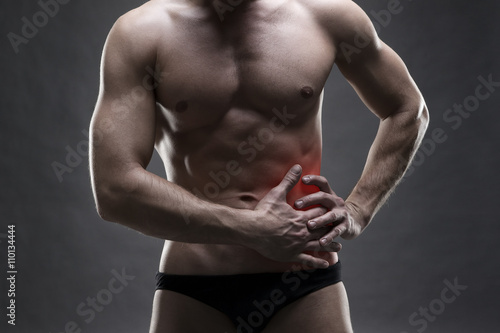 Fototapeta premium Pain in the left side. Muscular male body. Handsome bodybuilder posing on...