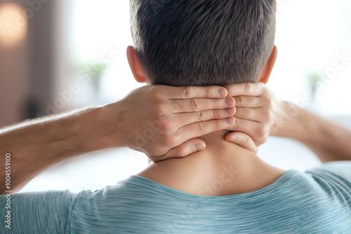 © ZAY WIN HTAI, Fototapeta premium Pain in the neck muscle of Caucasian man. Nape pain and nuchal stiffness concept.