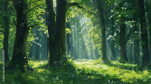 Obraz premium Paint a peaceful forest glade with sunlight filtering through the canopy of trees