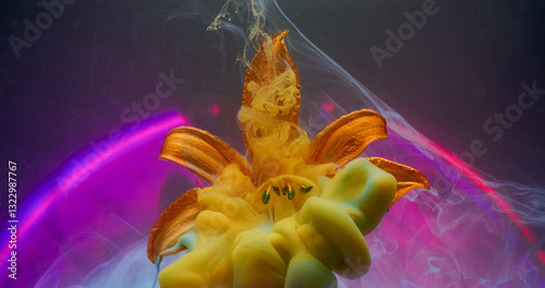 Fototapeta premium Paint mist. Flower smoke. Yellow brown flow fall on lily natural petals. Haze...