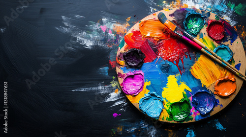 Fototapeta premium paint with paint brush, paint palette, on black background