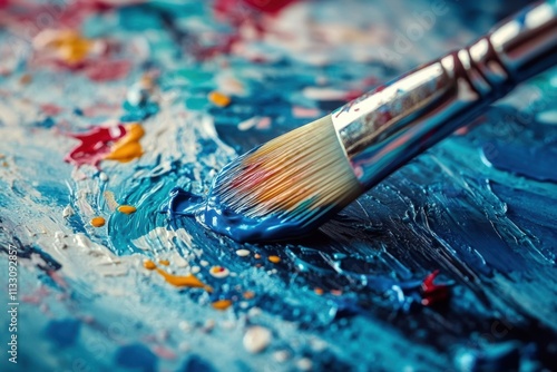 Fototapeta premium Paintbrush Applying Blue Paint To Canvas