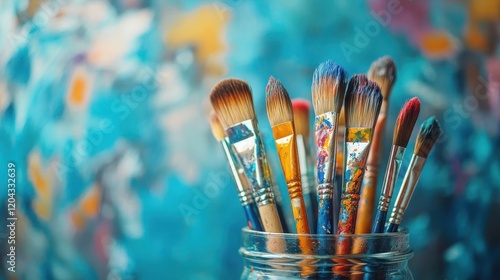 Fototapeta premium Paintbrushes in jar, close-up of colorful paintbrush tips in a glass jar, artistic studio setting