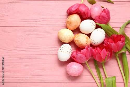 Fototapeta premium Painted Easter eggs and beautiful tulip flowers on pink wooden background