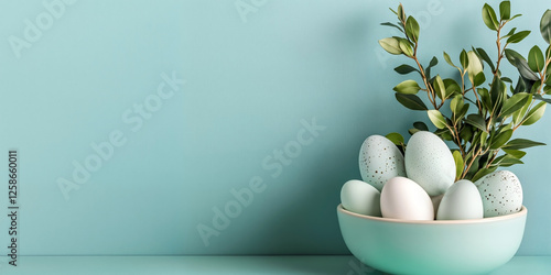 © Lisicus, Fototapeta premium Painted Easter eggs in blue bowl with leafy branch on light blue backdrop. Spring holiday decoration. Background, banner for design, card with copy space.