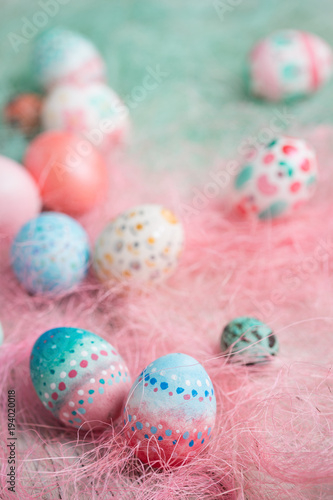 © Evgenia Tiplyashina, Obraz premium Painted Easter eggs on old boards