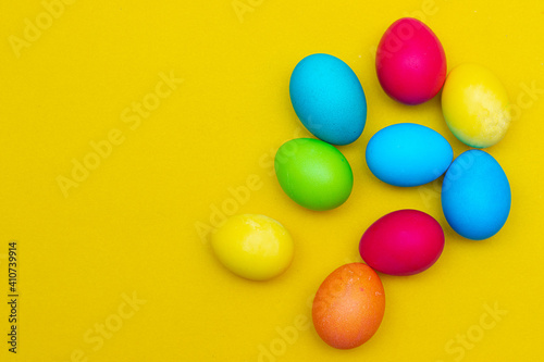 Obraz premium Painted eggs on a yellow background. Chicken eggs on a yellow background. Chicken eggs are colored. Easter. Orthodox holiday. An article about Easter. Article about eggs benefits and harms. Copy space