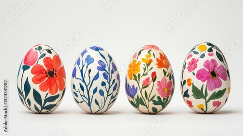 Fototapeta premium Painted floral Easter eggs, spring celebration, white background, greeting...