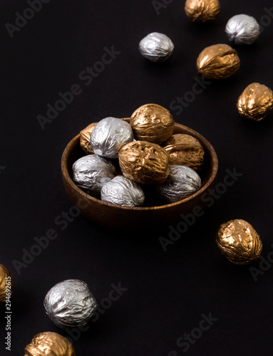 Obraz premium Painted golden and silver walnuts on wooden plate on black background