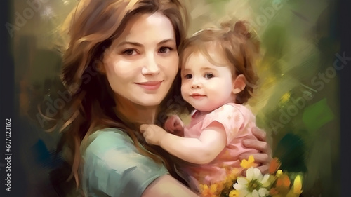 Obraz premium Painted image of a young mother holding her daughter in her arms, parenthood, mother's day