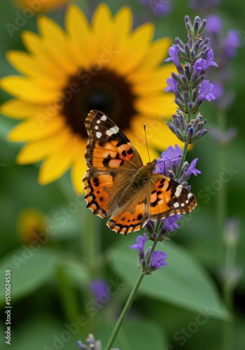 Fototapeta premium Painted Lady Butterfly on Lavender with Sunflower Background