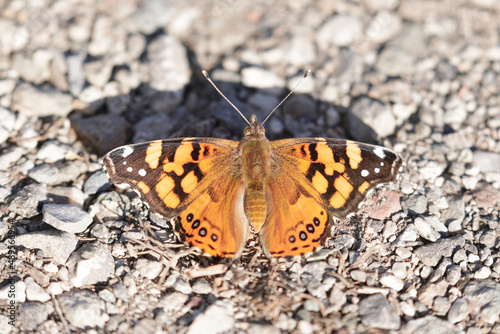 Fototapeta premium Painted Lady butterfly sunbathing on gravel. Santa Clara County, California,...