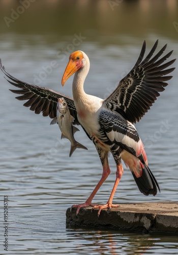 © Muhammad, Fototapeta premium Painted Stork with Fish Catch on Wooden Platform.