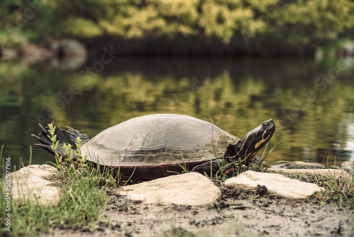 Obraz premium Painted turtle, basking, pond, water, amphibious reptile, colorful