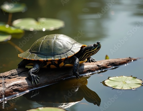 © Pete, Fototapeta premium Painted turtle rests on log in pond. Reptile displays shell, head and paws. Turtle in habitat with lily pads, water lilies. Wetland environment. Wildlife portrait.