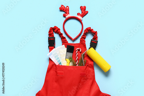 Obraz premium Painter's uniform with supplies and Christmas decor on blue background