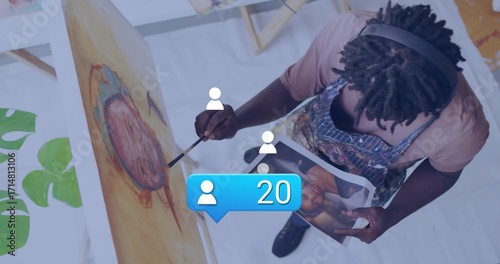 Naklejka premium Painting artist wearing apron applying color to canvas on easel in studio with brush and reference