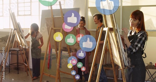 Naklejka premium Painting artists wearing aprons mixing colors on canvases in art studio, with easels and like icons