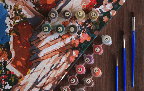 © Светлана Кармаева, Fototapeta premium painting coloring by numbers with acrylic paints in small jars with brushes
