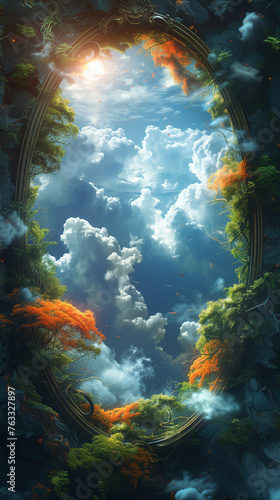 © alenagurenchuk, Obraz premium Painting depicting sky filled with clouds and trees in the foreground