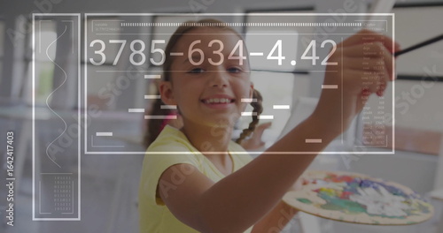 © vectorfusionart, Obraz premium Painting girl in yellow shirt applying paint to canvas on easel in studio, with paintbrush palette
