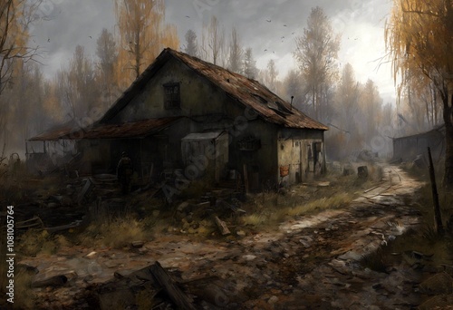 © Bohdan, Obraz premium Painting landscape in style game, abandoned house in the mountains