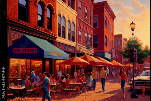 © Pixel Matrix, Naklejka premium Painting of a busy city street with people dining outside a restaurant and pizza parlor. Generative AI