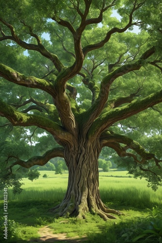 © haiqiang, Obraz premium painting of a large tree in a grassy field with a path