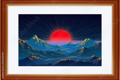 © He, Naklejka premium painting of a mountain scene with a sun in the sky